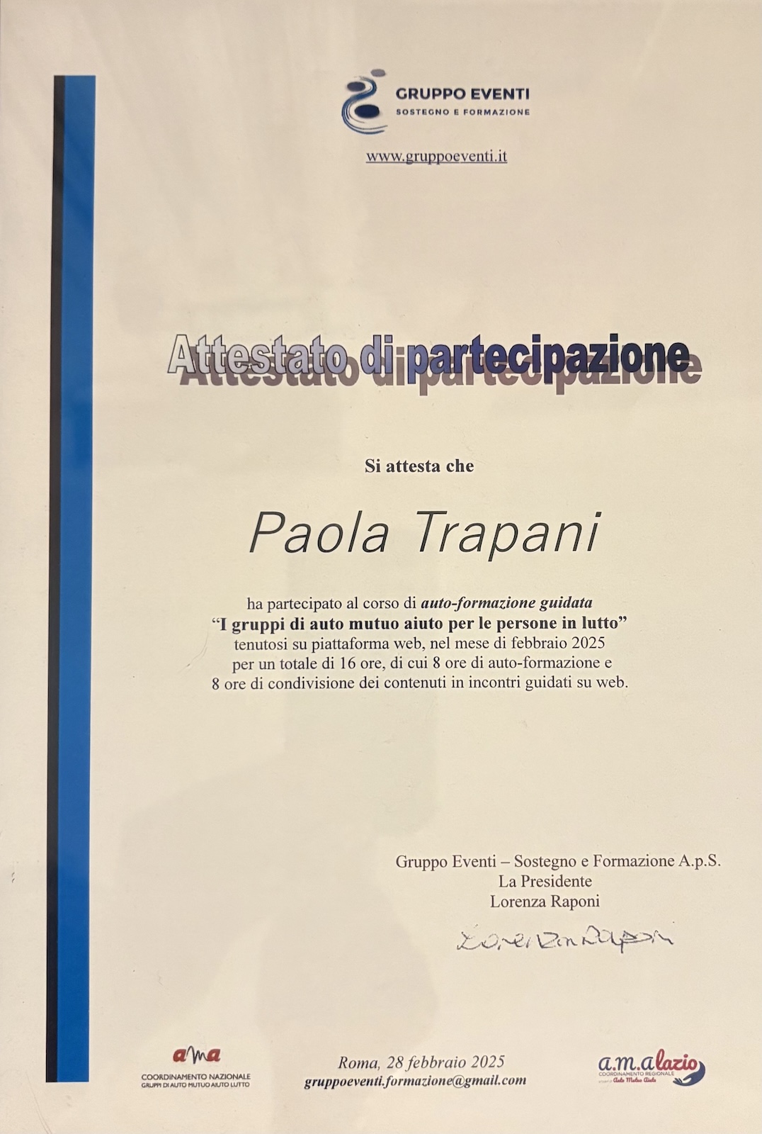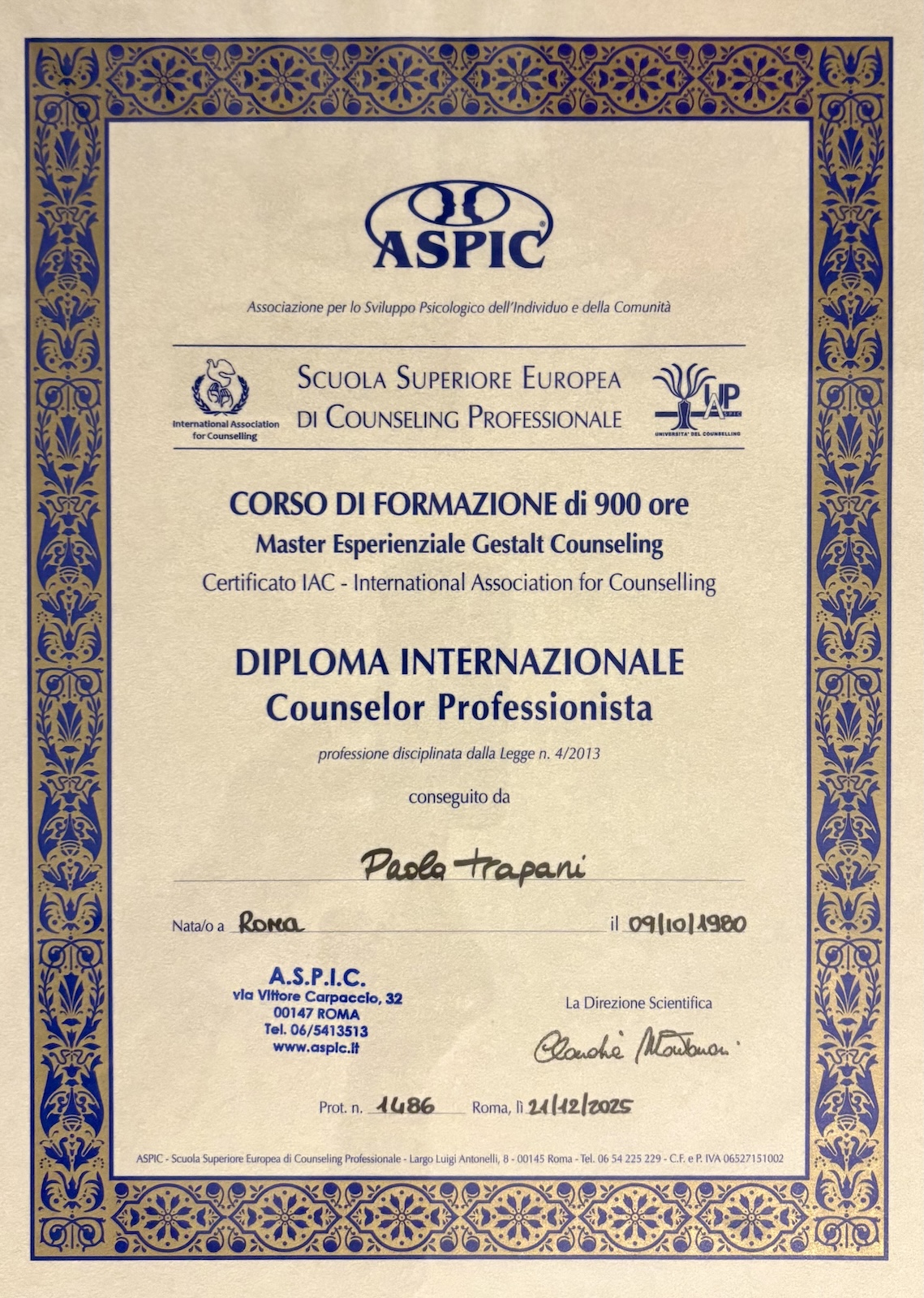 È stato un cammino intenso che ha integrato studio teorico, pratica e un profondo lavoro personale, permettendomi di sviluppare competenze nella relazione d’aiuto, nell’ascolto empatico e nell’accompagnamento delle persone nei momenti di difficoltà, cambiamento o ricerca di sé.